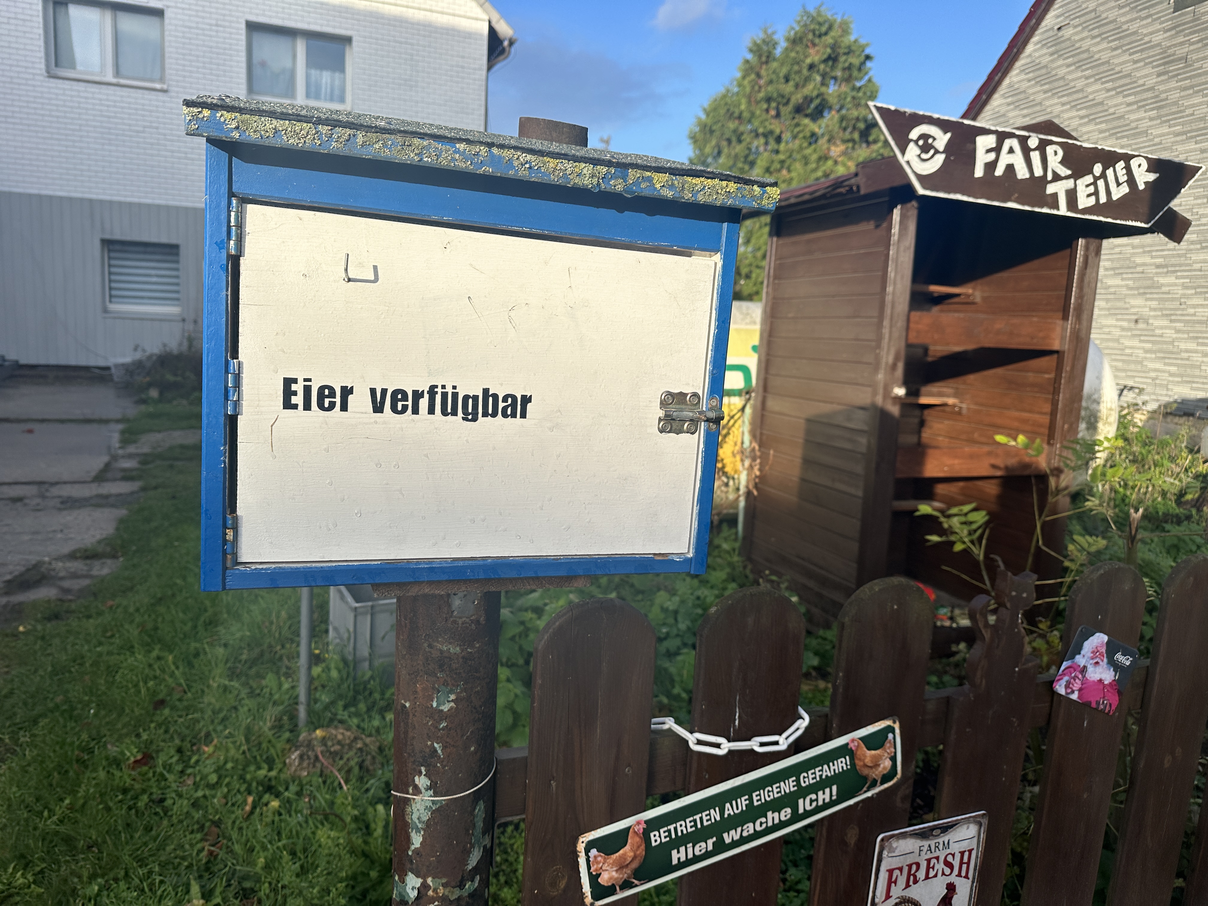 Hier gibt es Eier zu kaufen. 24/7 geöffnet. 10 Stück 3,50€